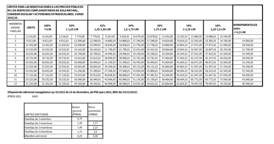 LÍMITES PARA LAS BONIFICACIONES DEL PRECIO PÚBLICO PARA EL CURSO 2025/2026
